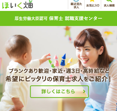 ほいく畑は、フルタイムパート、週3~、短時間OKのパート、ブランクOK求人や主婦の方歓迎の求人も多いです。厚生労働大臣認可の保育士 就職支援センターでもある保育士転職サイトです。保育園はもちろん、病院内保育、企業内保育・託児所まで幅広く扱っています。 準認可保育園、認可保育園別で検索出来たりもするので、保育士ワーカーを使ったことがある方は、ほいく畑も併せて使ってみましょう。求人数は、全国2万件台ですが、ほいく畑にしかない独自の非公開求人もあります。>>さらに詳しいほいく畑の詳細へ 対応地域:こちら |