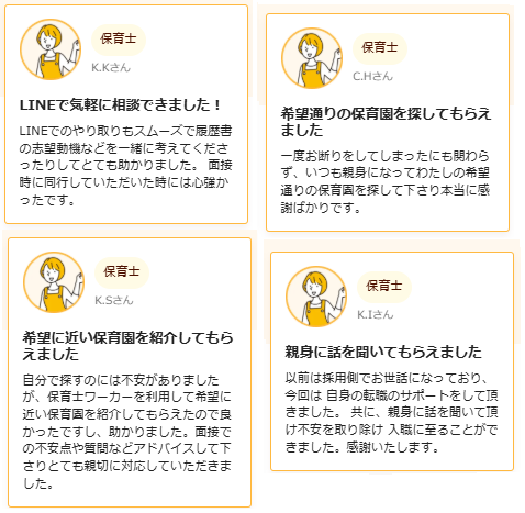 担当者さんには前職を辞めた理由もしっかりと聞いていただき、「これからもっと自分に合った園で1から頑張れば、憧れていた保育士さんとしてスキルアップが出きますよ!」と励まして頂き、1ヵ月の経験しかない私でも大丈夫なんだ!と前向きになることが出来ました。