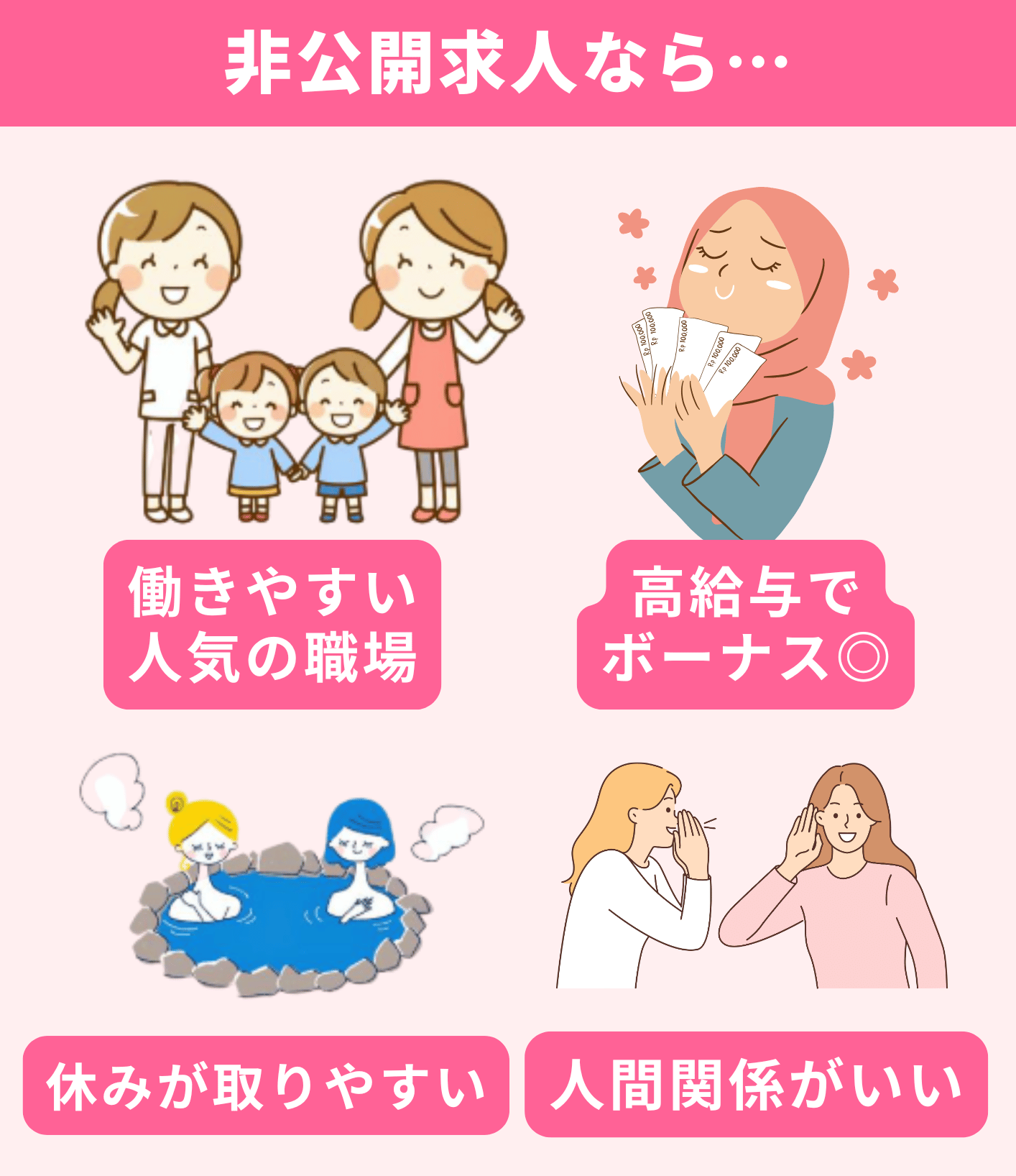 また、給与・待遇の良い保育園や幼稚園以外でも「オープニングや完全土日休みの園・人気のこども園、企業・院内保育、家賃補助がある職場」なども応募が殺到するので非公開で求人されています。