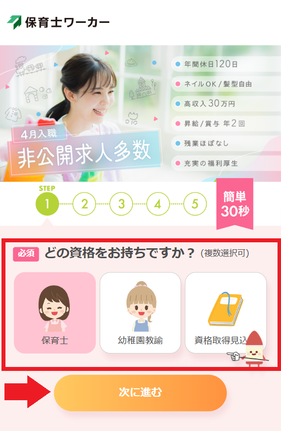 「保育士」「幼稚園教諭」「資格取得見込み」という項目があるので、当てはまるものを選びましょう。