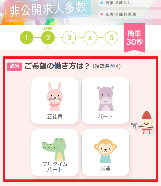 そんな方にピッタリの残業なし・平日のみのパート勤務の保育園やこども園、幼稚園の非公開求人も紹介してくれるので、こだわりがある方ほどほいく畑を利用してみましょう。