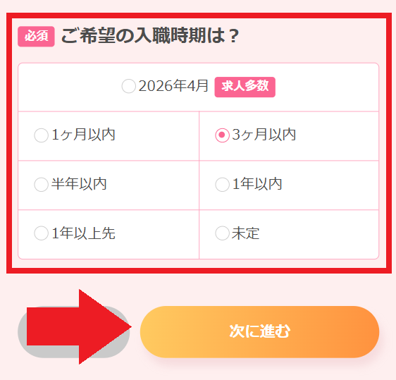 4月入職を選択すると、4月入職に合わせて求人紹介やサポートを受けることができます。