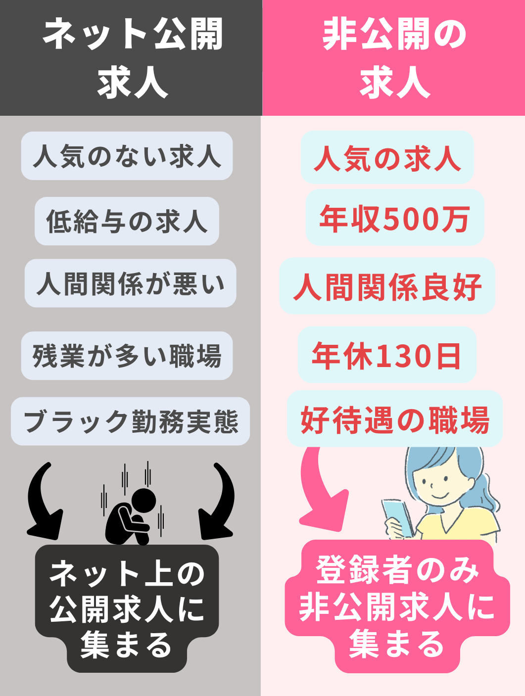 入れ替わりが激しかったり、給与体系、勤務体系、人間関係が悪い施設の求人は、残り物になり、ネットの公開求人やハローワーク求人に回されます。